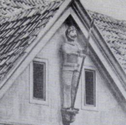 Mit diesen Worten stiegen die beiden drei Treppen hoch. Oben öffnete Ebersberg das Giebelfenster und ließ den Dienstmann hinaussehen. „Ich will, da nun der Riese heruntergenommen worden ist, das schöne Bild nicht stören, daher bitte ich Sie, auf das Podest des Riesen zu steigen und dort seine Lanze zu halten.“