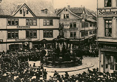 Auf dem Holzmarkt wird das Lutherdenkmal errichtet und 1936 auf den Platz vor dem Rathaus versetzt. |